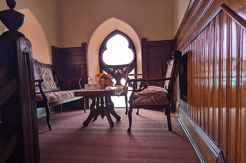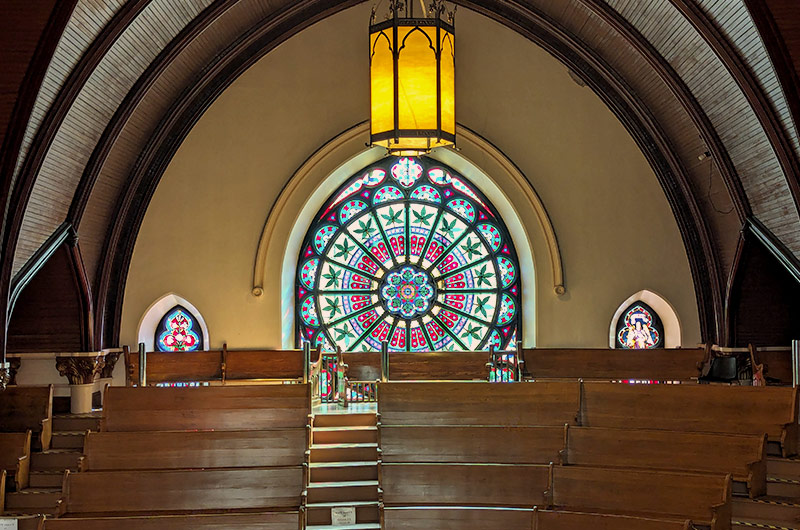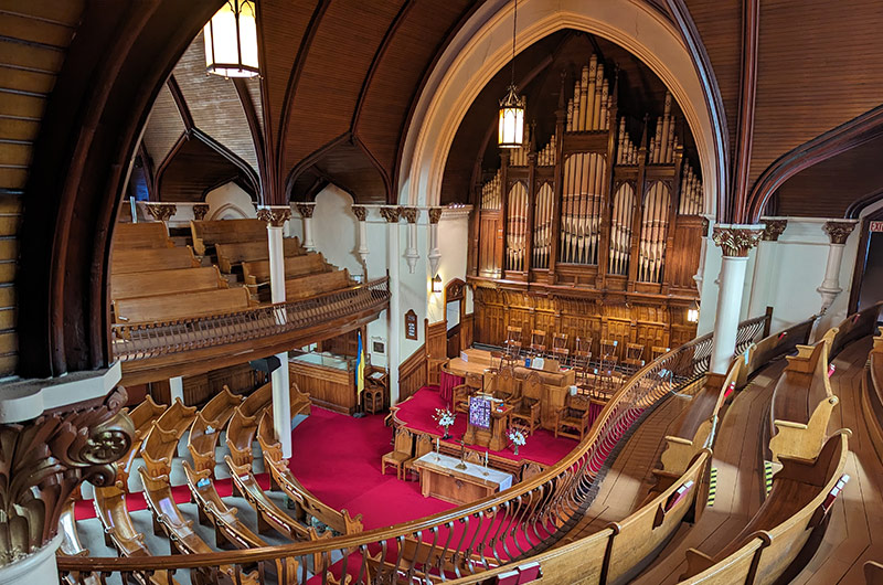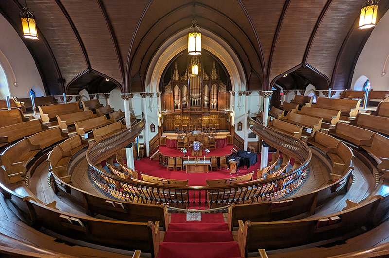 The interior is without a doubt one of the more beautiful protestant sanctuaries in the province. The downstairs has a seating capacity of 700 people and the balcony can accommodate another 400 people. Not included in the original construction, the balcony was added in 1907 to handle increased attendance at church. Most of the wood used in the sanctuary is oak and all the furniture was handcrafted here, in Amherst. The centre of the sanctuary reaches 37 feet to the wood panel ceiling. Note the curved shape of the auditorium and the way the balcony follows the curve. Throughout the building are many unique rooms. Upstairs you will find two tower rooms; One is a parlour, and the other one is a proposed office. Both have been completely restored, as has the front entryway. Located on the main floor is the church parlour, meeting room and the church offices. A board room has been completed in a restored section at the back of the church. Upstairs is another parlour as well as the nursery and children's rooms. In the basement are the Sunday school rooms, an auditorium, kitchen and the boiler room. With two fully equipped and modernized kitchens, the members are able to meet any need.